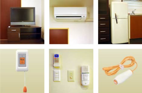 エアコン、ミニ冷蔵庫、緊急コール、照明器具、テレビ、電話端子、ドアホン、物干し金具、洗濯機、電動ベッド、換気扇
