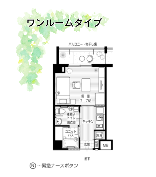 緊急ナースボタンが各居室・トイレ・浴室についており、具合が悪くなった時も安心です。